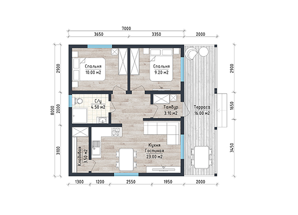 Отделка стен снаружи: | имитация бруса 16 мм по ветрозащитной мембране Изоспан А и контр обрешетке |