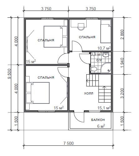 Потолок 1-го этажа: | высота в чистоте - 2500 мм; потолочное перекрытие: доска 45 х 145 мм (строганая камерной сушки), шаг не более 600 мм. |