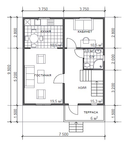 Лестница при входе: | тетива: доска 50 х 150мм; ступени: доска 50 х 150 мм; |